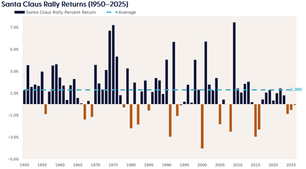 Despite a positive trading session on Monday, the S&P 500 fell short of delivering a gain during the seven-session holiday trading window known as the Santa Claus rally. The Santa Claus rally, which covers the last 5 trading days of the year plus the first 2 of the new year, was first defined by Yale Hirsch in the Stock Trader’s Almanac in the early 1970s. This period has historically provided a seasonal tailwind for stocks, with an average return of 1.3% for the S&P 500 since 1950. Stocks have never experienced a negative Santa Claus rally for three consecutive years—until now! While the S&P 500 ended just a few points lower during this year’s window, it follows negative returns in both 2023 and 2024. Market historians often point to the old adage by Yale Hirsch: “If Santa Claus should fail to call, bears may come to Broad and Wall”, as past failed Santa Claus rallies have preceded some nasty bear markets (2000 and 2008 most notably) and some mild market selloffs (February 2016 and April 2025 most recently). However, let’s be clear, a negative Santa Claus rally doesn’t always portend a negative year for stocks… just look at the past 2 years as evidence of that.